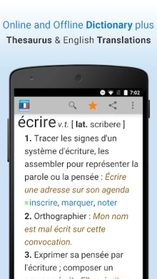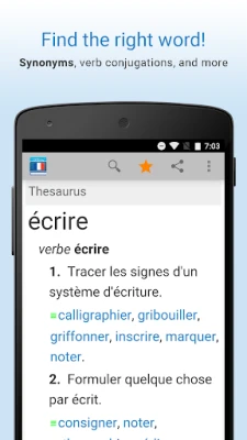 Free French dictionary and thesaurus plus French to English translations and an offline dictionary. Play audio pronunciations of words, save unlimited bookmarks, and use voice searches.