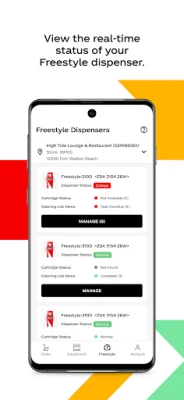 • Request equipment service, order from a full catalog of small parts, and view handy knowledge articles. • Quickly add cartridges to your cart with Proposed Order. • View real-time cartridge levels and cleaning tasks for your Freestyle dispenser.
