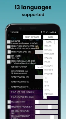 Turn your phone into a Spectrum Analyzer. Speccy is an Audio Spectrum Analysis tool, which visualizes the spread of frequencies detected by your microphone. It uses an FFT signal processing algorithm and supports the most languages of any similar app. It's also the only app of its kind allowing you to export audio snapshot data to the clipboard, for plotting in Excel, etc.